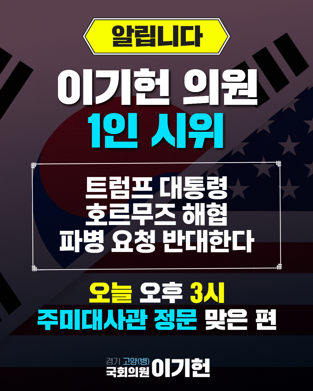 | 이기헌 의원 1인 시위 <트럼프 대통령 호르무즈 해협 파병 요청 반대한다> 3.17(화) 오전 10시30분 주한미대사관 정문 맞은 편 (0) | 2026.03.17 |
