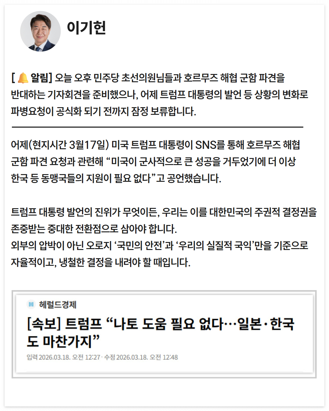 외부의 압박이 아닌 오로지 ‘국민의 안전’과 ‘우리의 실질적 국익’만을 기준으로 자율적이고, 냉철한 결정을 내려야 할 때입니다.