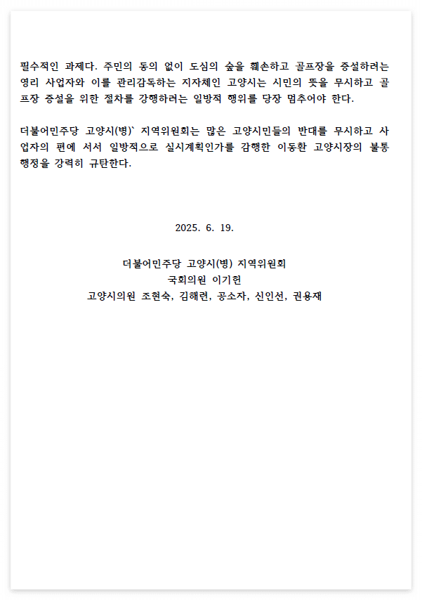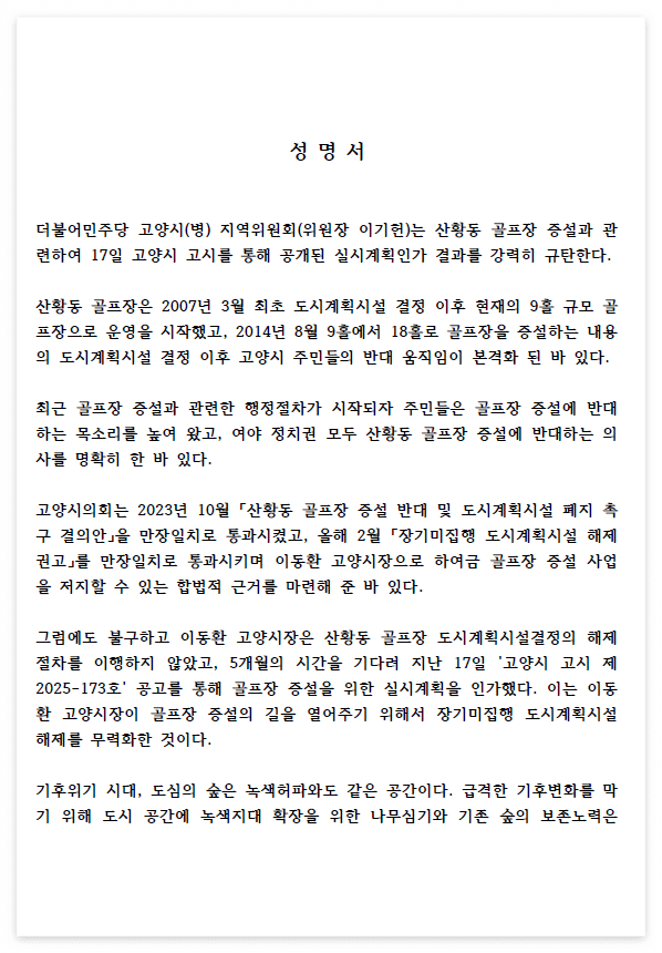 더불어민주당 고양시(병) 지역위원회는 산황동 골프장 증설 실시계획 인가를 실행한 이동환 고양시장을 규탄하는 성명서를 지역위원장(이기헌 국회의원)과 시의원 전원(조현숙, 김해련, 공소자, 신인선, 권용재)의 명의로 발표했습니다.