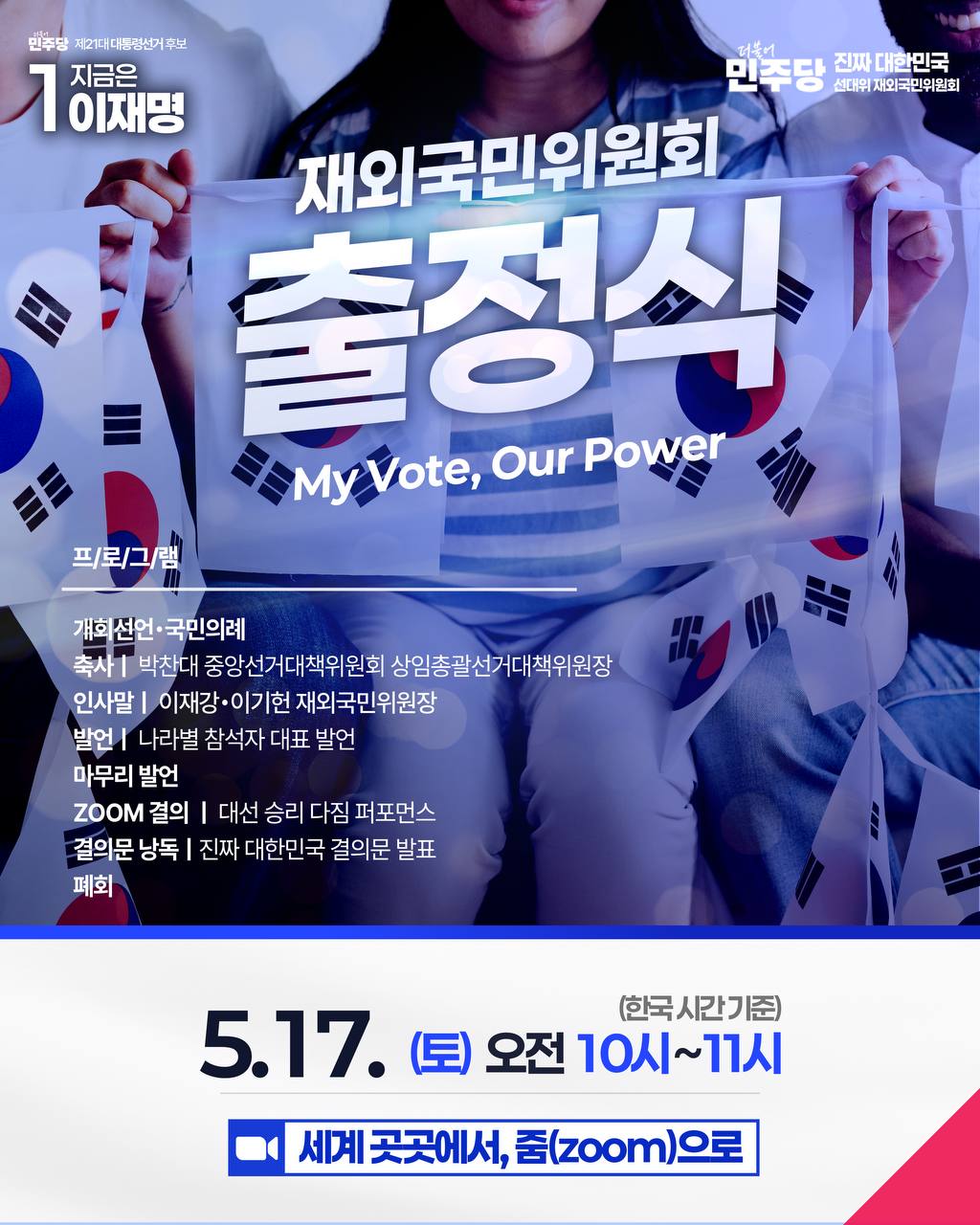 더불어민주당 선거대책위원회 재외국민위원회는 5월 17일 오전 10시(한국시간), 박찬대 상임총괄선거대책위원장, 이재강·이기헌 공동재외국민위원장이 참석한 가운데 온라인 출정식을 개최했