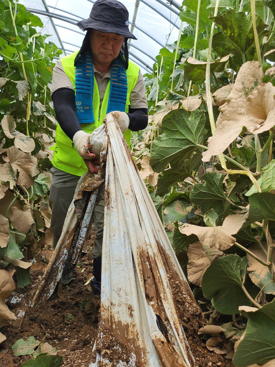 오늘 수해 복구를 위해 찾아간 곳은 예산의 한 농가 입니다. 이곳은 멜론 농장인데, 수해로 수확 직전에 모두 썩어버렸습니다.