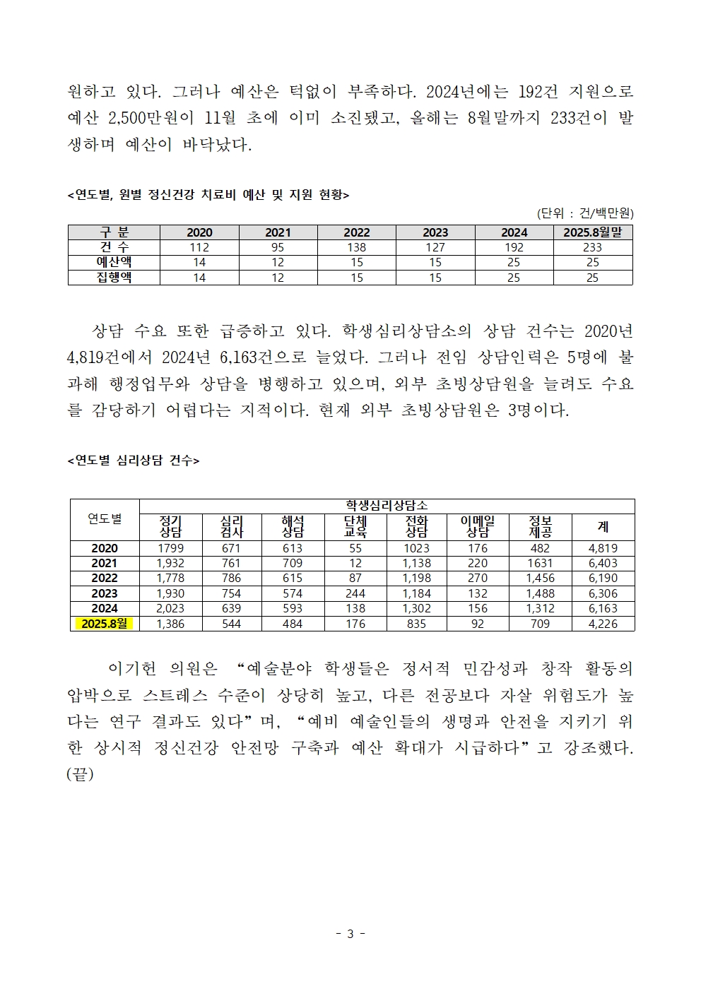 한예종은 심리적 어려움을 겪는 학생들에게 정신건강의학과 진료비‧약제비, 외부 심리상담 기관 비용 등을 학생 1인당 연간 최대 50만원까지 지원하고 있다. 그러나 예산은 턱없이 부족하다. 2024년에는 192건 지원으로 예산 2,500만원이 11월 초에 이미 소진됐고, 올해는 8월말까지 233건이 발생하며 예산이 바닥났다.