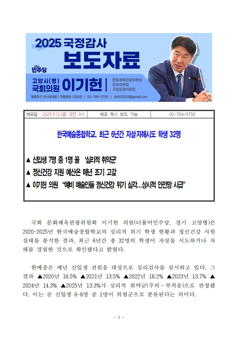 국회 문화체육관광위원회 이기헌 의원(더불어민주당, 경기 고양병)은2020~2025년 한국예술종합학교의 심리적 위기 학생 현황과 정신건강 지원 실태를 분석한 결과, 최근 6년간 총 32명의 학생이 자살을 시도하거나 자해를 경험한 것으로 확인됐다고 밝혔다.
