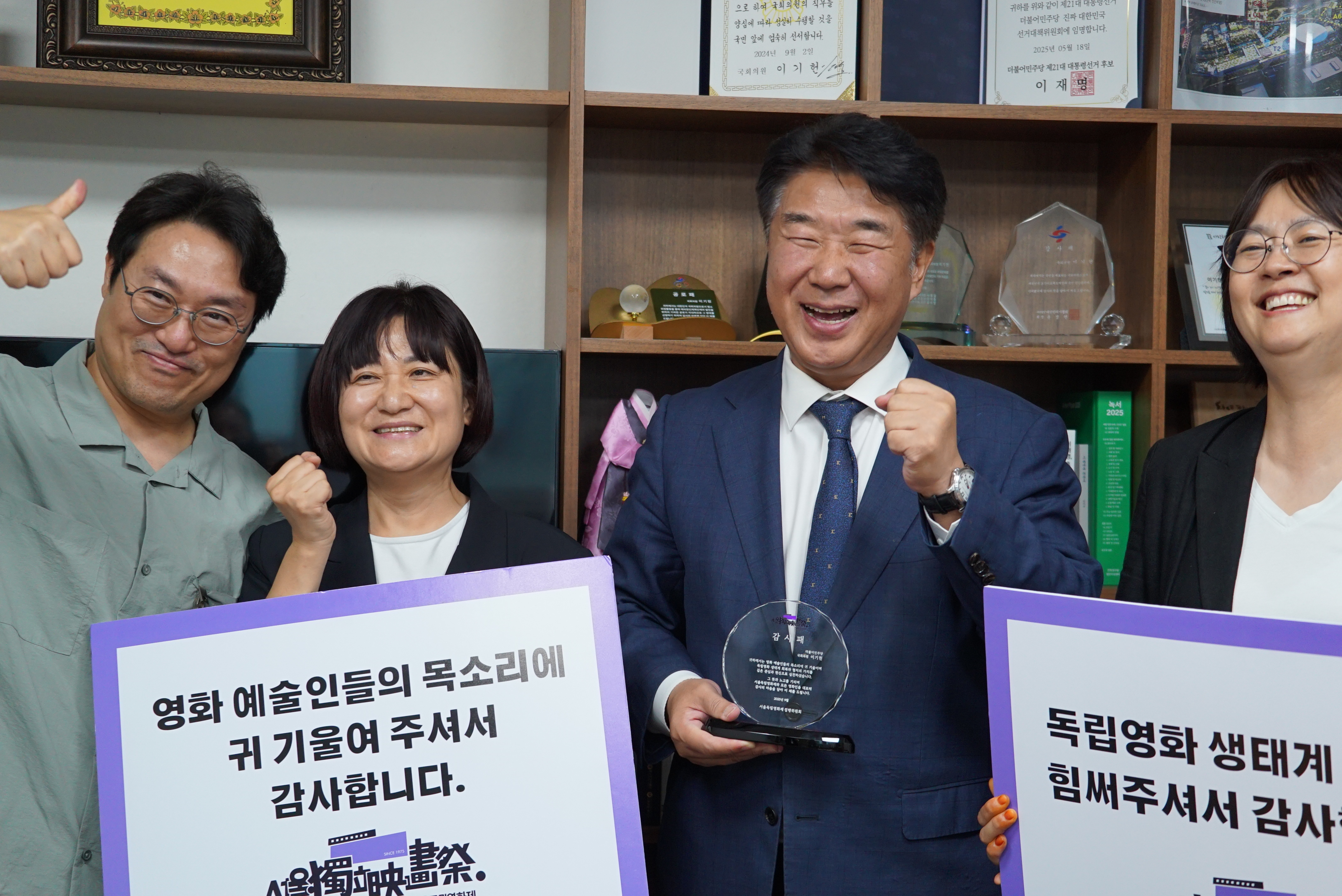 이번 감사패를 주신 것은 영화 예술인 여러분의 격려이자 더 열심히 하라는 뜻이라고 생각합니다. 앞으로도 영화인들과 함께 한국 영화 산업 발전과 독립영화 생태계 회복을 위해 최선을 다하겠습니다.