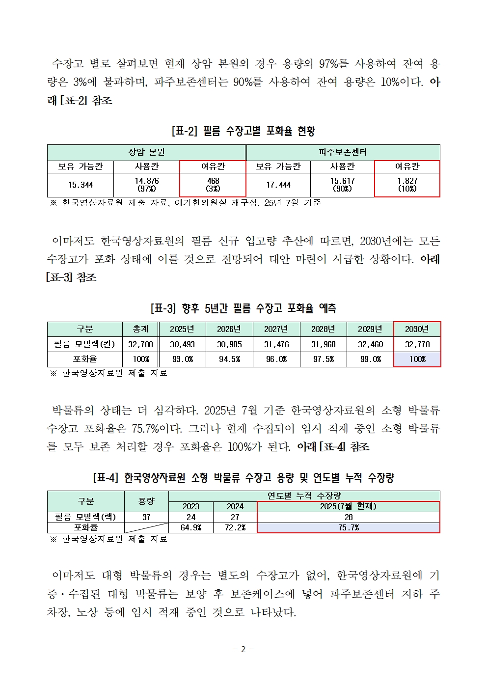 국회 문화체육관광위원회 소속 이기헌 국회의원(더불어민주당, 고양시병)이 한국영상자료원으로부터 제출받은 자료에 따르면, 2025년 7월 기준 한국영상자료원의 필름 수장고 포화율은 93%에 달하는 것으로 밝혀졌다. 아래 [표-1] 참조