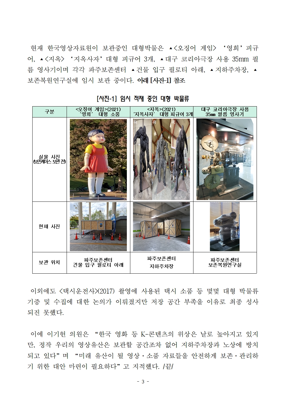 현재 한국영상자료원이 보관중인 대형박물은 ▴<오징어 게임> ‘영희’피규어, ▴<지옥> ‘지옥사자’대형 피규어 3개, ▴대구 코리아극장 사용 35mm 필름 영사기이며 각각 파주보존센터 ▴건물 입구 필로티 아래, ▴지하주차장, ▴보존복원연구실에 임시 보관 중이다. 아래 [사진-1] 참조