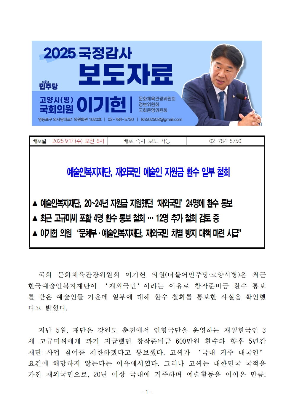 이에 대해 이기헌 의원은 “국내에 장기간 거주하며 활동하는 재외국민 예술인을 단순히 신분상의 이유로 배제하는 것은 바람직하지 않다”며 “재단의 일부 철회 조치는 개별 구제에 그칠 게 아니라, 제도적 개선으로 이어져야 한다”고 강조했다.