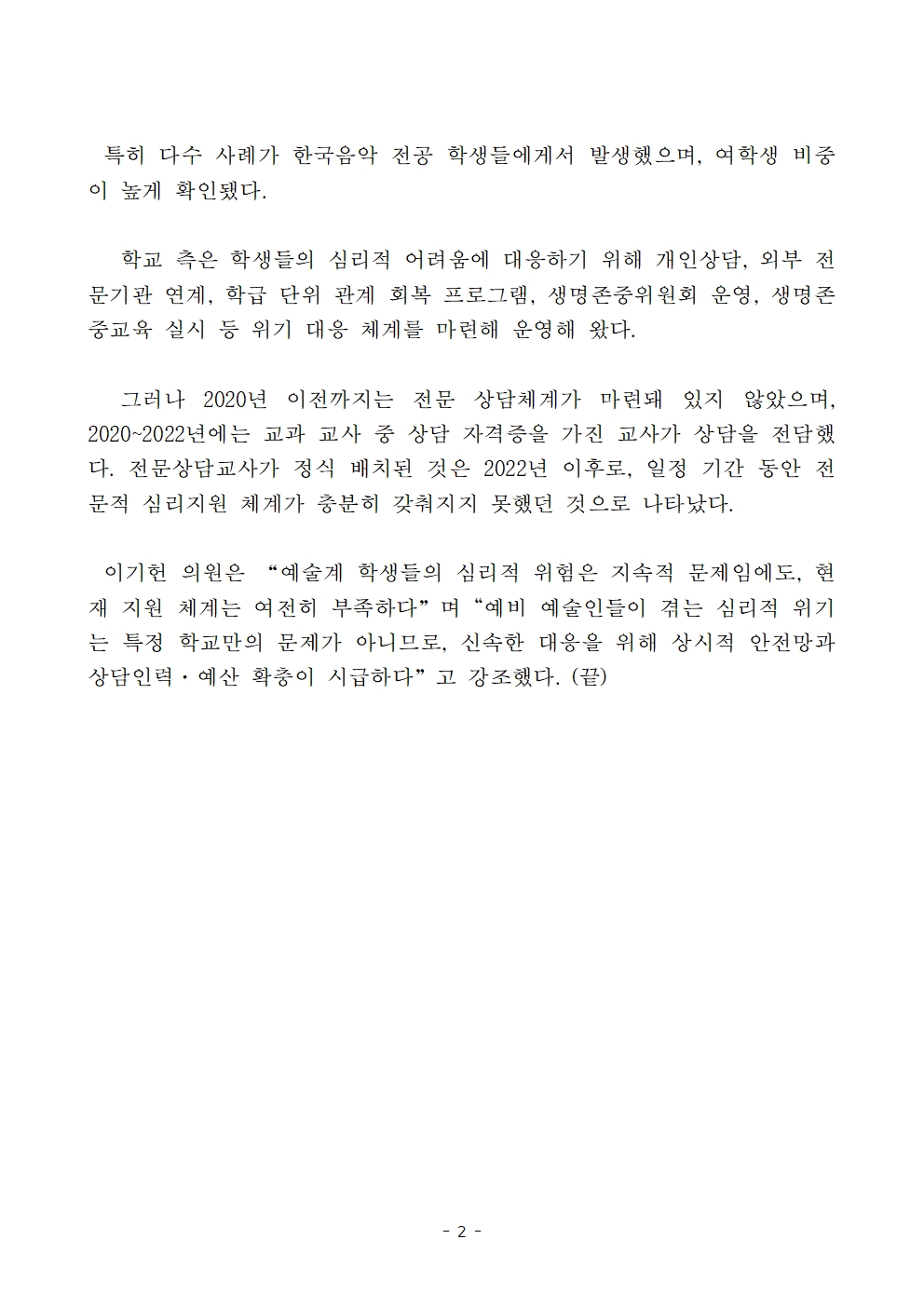 이기헌 의원은 “예술계 학생들의 심리적 위험은 지속적 문제임에도, 현재 지원 체계는 여전히 부족하다”며 "예비 예술인들이 겪는 심리적 위기는 특정 학교만의 문제가 아니므로, 신속한 대응을 위해 상시적 안전망과 상담인력·예산 확충이 시급하다”고 강조했다. (끝)