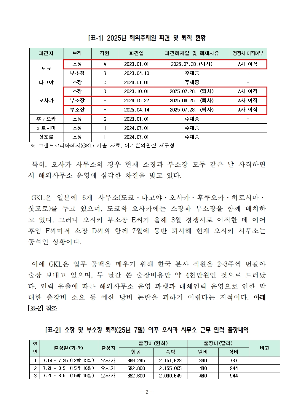 [표-2] 소장 및 부소장 퇴직(25년 7월) 이후 오사카 사무소 근무 인력 출장내역