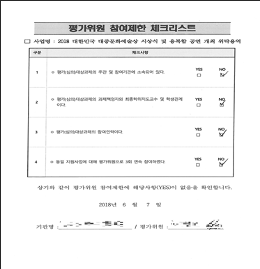 또한, 평가위원들이 한국콘텐츠진흥원에 제출해야 하는 ‘참여 제한 체크리스트’에 B씨는 이해관계가 ‘없음’으로 제출했고, 평가 당일에도 한국콘텐츠진흥원측에 따로 이해관계 사실을 알리지 않은 것으로 밝혀졌다. 아래 [사진-1] 참조