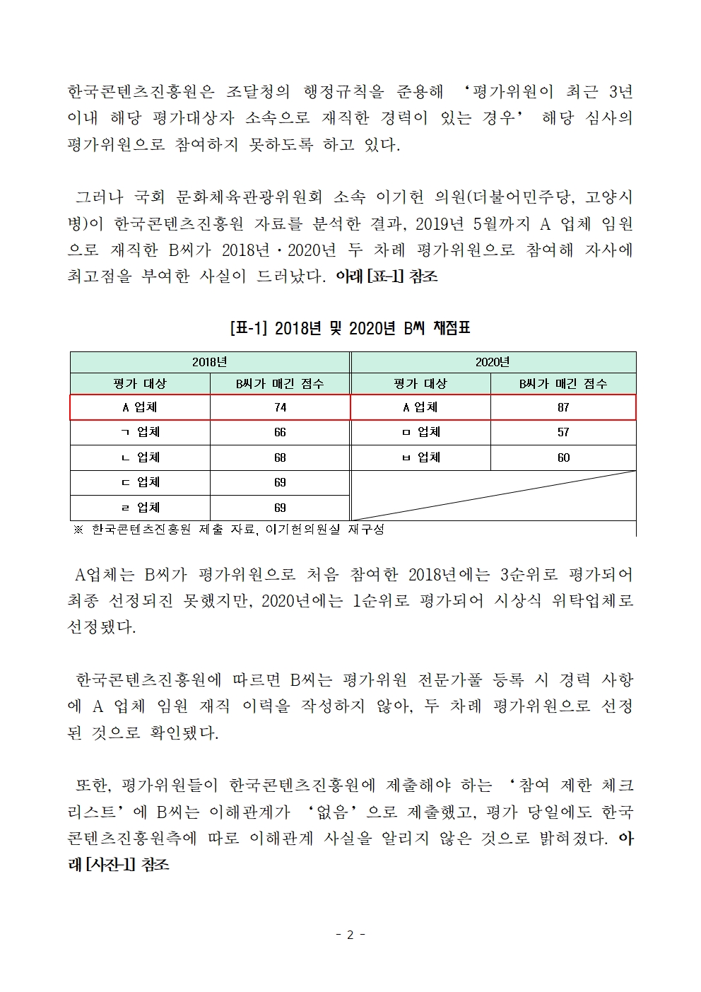 그러나 국회 문화체육관광위원회 소속 이기헌 의원(더불어민주당, 고양시병)이 한국콘텐츠진흥원 자료를 분석한 결과, 2019년 5월까지 A 업체 임원으로 재직한 B씨가 2018년·2020년 두 차례 평가위원으로 참여해 자사에 최고점을 부여한 사실이 드러났다. 아래 [표-1] 참조