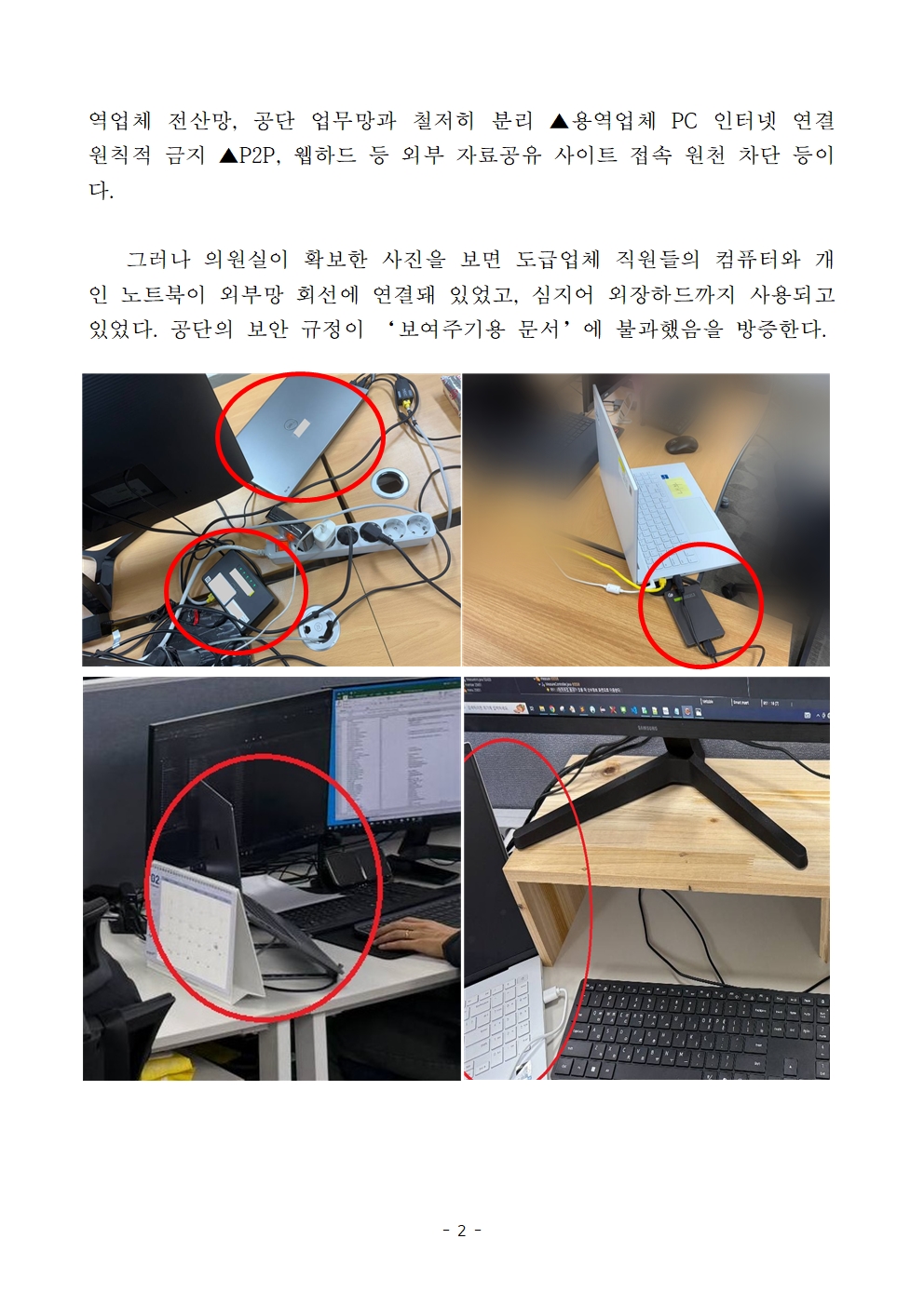 그러나 의원실이 확보한 사진을 보면 도급업체 직원들의 컴퓨터와 개인 노트북이 외부망 회선에 연결돼 있었고, 심지어 외장하드까지 사용되고 있었다. 공단의 보안 규정이 ‘보여주기용 문서’에 불과했음을 방증한다.