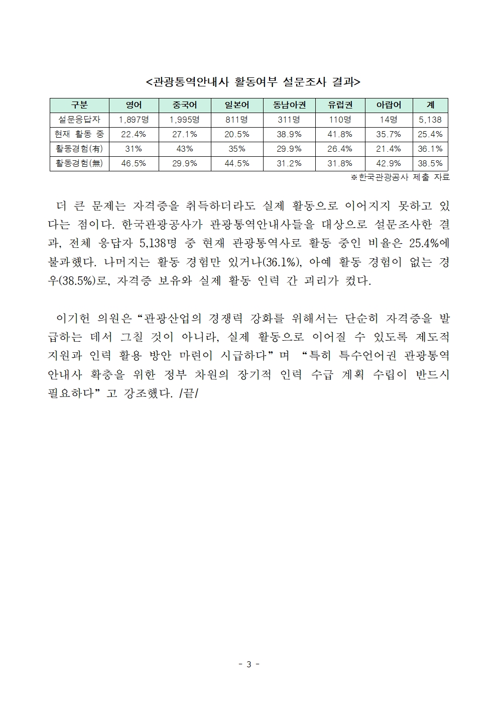 <관광통역안내사 활동여부 설문조사 결과>