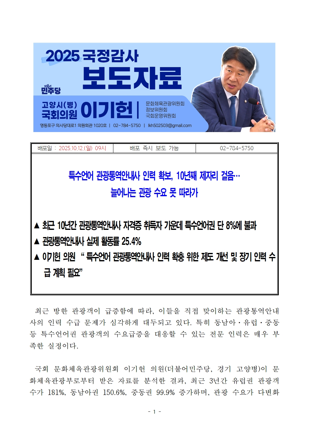 이기헌 의원은“관광산업의 경쟁력 강화를 위해서는 단순히 자격증을 발급하는 데서 그칠 것이 아니라, 실제 활동으로 이어질 수 있도록 제도적 지원과 인력 활용 방안 마련이 시급하다”며 “특히 특수언어권 관광통역안내사 확충을 위한 정부 차원의 장기적 인력 수급 계획 수립이 반드시 필요하다”고 강조했다. /끝/