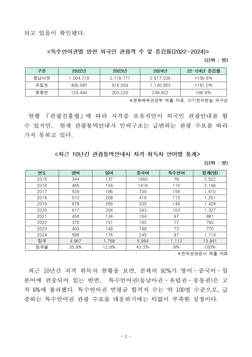 최근 10년간 자격 취득자 현황을 보면, 전체의 92%가 영어·중국어·일본어에 편중되어 있는 반면, 특수언어권(동남아권·유럽권·중동권)은 고작 8%에 불과했다. 특수언어권 연평균 합격자 수는 약 100명 수준으로, 급증하는 특수언어권 관광 수요를 대응하기에는 턱없이 부족한 실정이다.