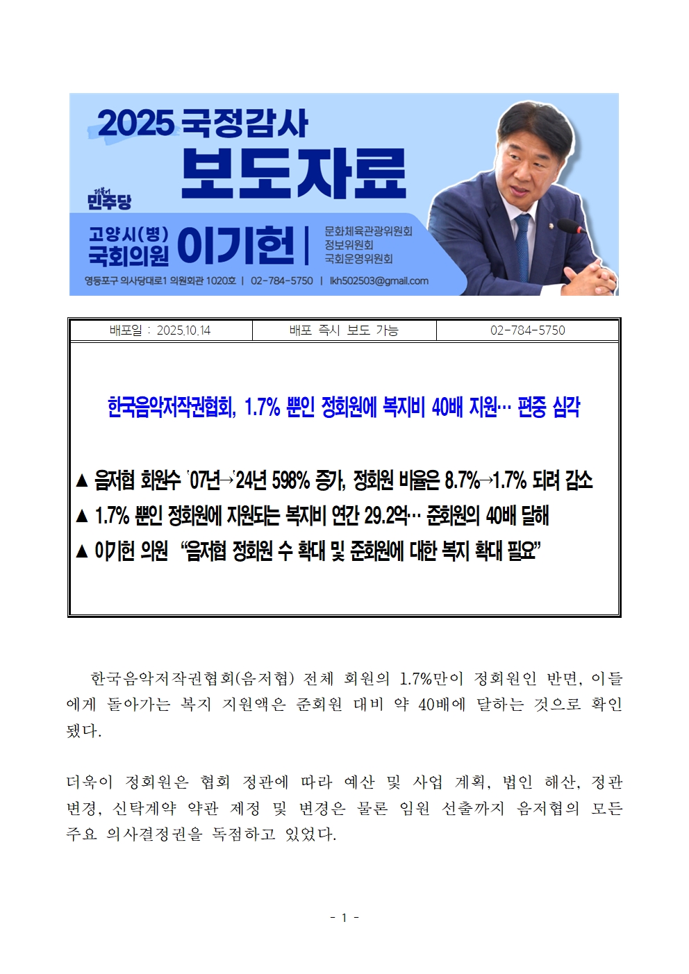 이기헌 의원은 “음저협 운영의 개방성과 투명성 강화 및 의사결정의 민주적 발전을 위해 정회원 비율을 늘려야 하며, 현재 극소수에게 집중된 복지 예산을 준회원에게 확대할 방안을 조속히 마련해야 한다”고 밝혔다. /끝/
