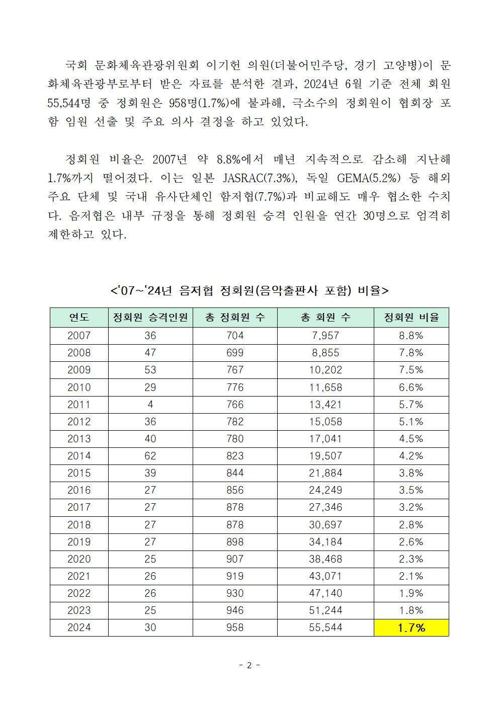 정회원 비율은 2007년 약 8.8%에서 매년 지속적으로 감소해 지난해 1.7%까지 떨어졌다. 이는 일본 JASRAC(7.3%), 독일 GEMA(5.2%) 등 해외 주요 단체 및 국내 유사단체인 함저협(7.7%)과 비교해도 매우 협소한 수치다. 음저협은 내부 규정을 통해 정회원 승격 인원을 연간 30명으로 엄격히 제한하고 있다.