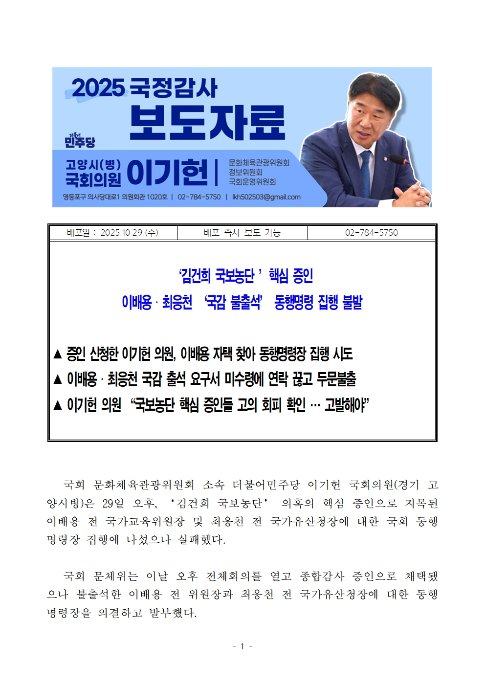 국회 문화체육관광위원회 소속 더불어민주당 이기헌 국회의원(경기 고양시병)은 29일 오후, ‘김건희 국보농단’ 의혹의 핵심 증인으로 지목된 이배용 전 국가교육위원장 및 최응천 전 국가유산청장에 대한 국회 동행명령장 집행에 나섰으나 실패했다.